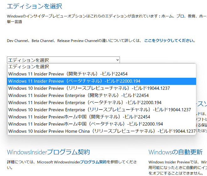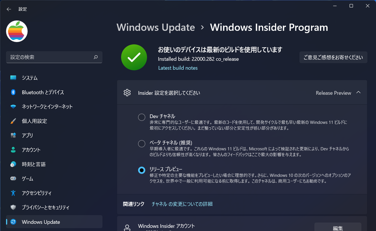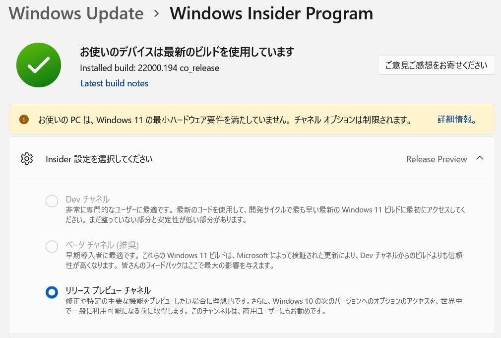 バージョン21H2 インストールビルドは、22000.194になった。ちなみに無理やり入れたこの環境では、リリースプレビュー以外に変更ができない