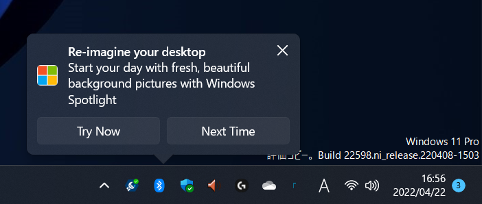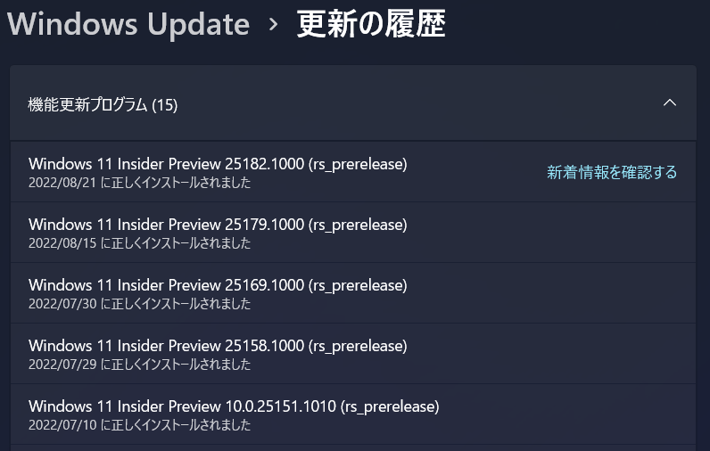 DEV環境のほうに新しいbuidがきていた、更新が早い。OS ビルド 22504.1000
