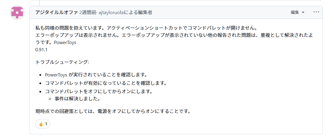 powertoysの設定画面でコマンドパレットをオフにしてからオンにしなおす