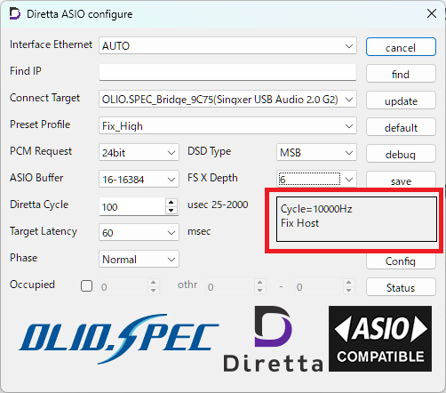 Cycle の Hz は、Diretta の“実際の動作テンポ”を示す重要な指標で、音の鮮度・密度・空間表現に直結します。調整の基本は「まず安定値で音を出し、そこから Cycle を少しずつ下げて Hz を上げていく」こと。Cycle を下げるほど音像が引き締まり、透明度が増し、生々しい音になりますが、PC やネットワークの負荷が増え、音切れのリスクも高まります。音切れが出たら一段戻すことで、その環境で最も高い Hz を維持できる“最適点”が見つかります。また、Cycle は FS X Depth や Target Latency とも密接に関係しており、3つを少しずつ低めに攻めつつ、全体として安定するポイントを探るのがコツです。どれか1つだけを極端に攻めるのではなく、バランスを取りながら調整することで、最も自然で鮮度の高い再生が可能になります。