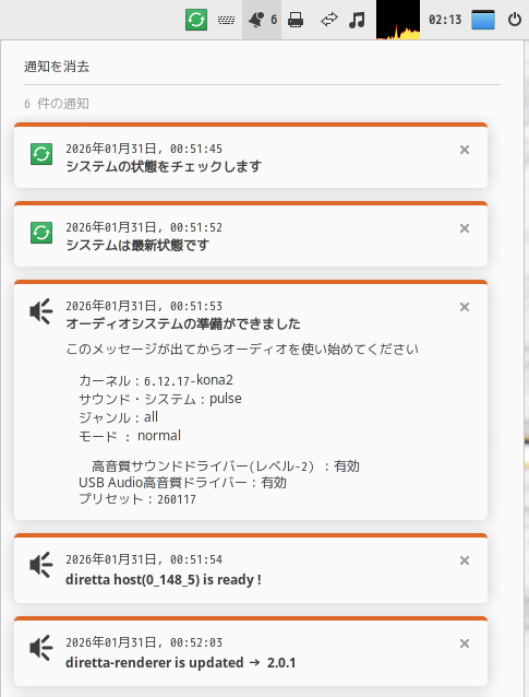 フォーラム:https://groups.google.com/g/konalinux26/2/11 Diretta周りの更新