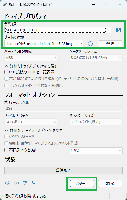 デバイス:Targetで起動用のメディアを選択(USBメモリやSDカード)